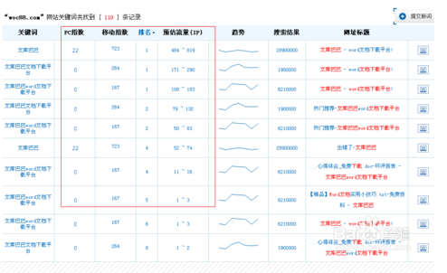 通过上面的分析,关健字百度指数高,流量就越高。理论上说是这样的,但给网站带来的预估流量,就根关键字的排名有关了。如下图:文库这个关健字的百度指数很高,但给网站的流量却为0,因为排名很差。